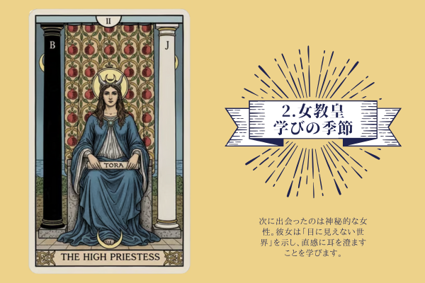 正位置の意味 女教皇の正位置は、直感力の高まりと内なる知恵への信頼を表しています。論理的思考よりも直感を重視することで、重要な答えや洞察を得られる時期で... -
